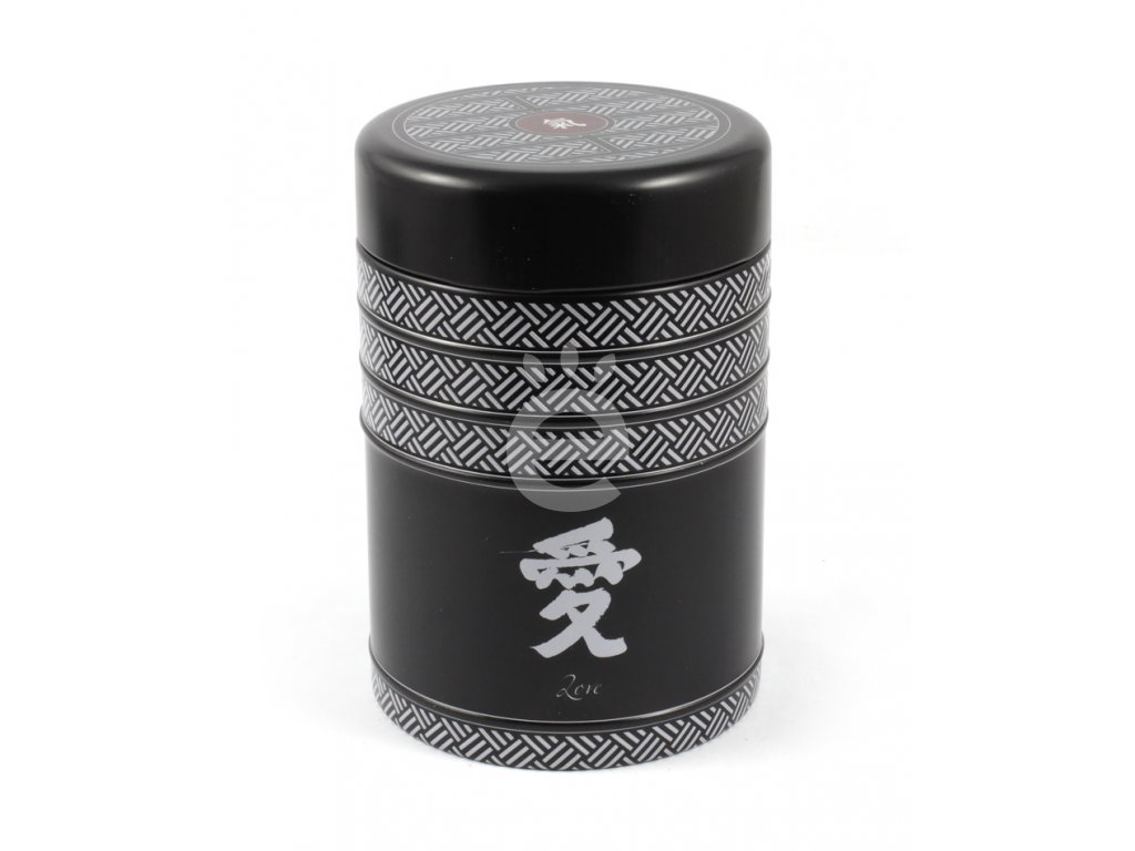 Čajová dóza v černé barvě s víčkem, s čínským znakem pro čaj. Objem dózy je na 125 g čaje, středně drceného.