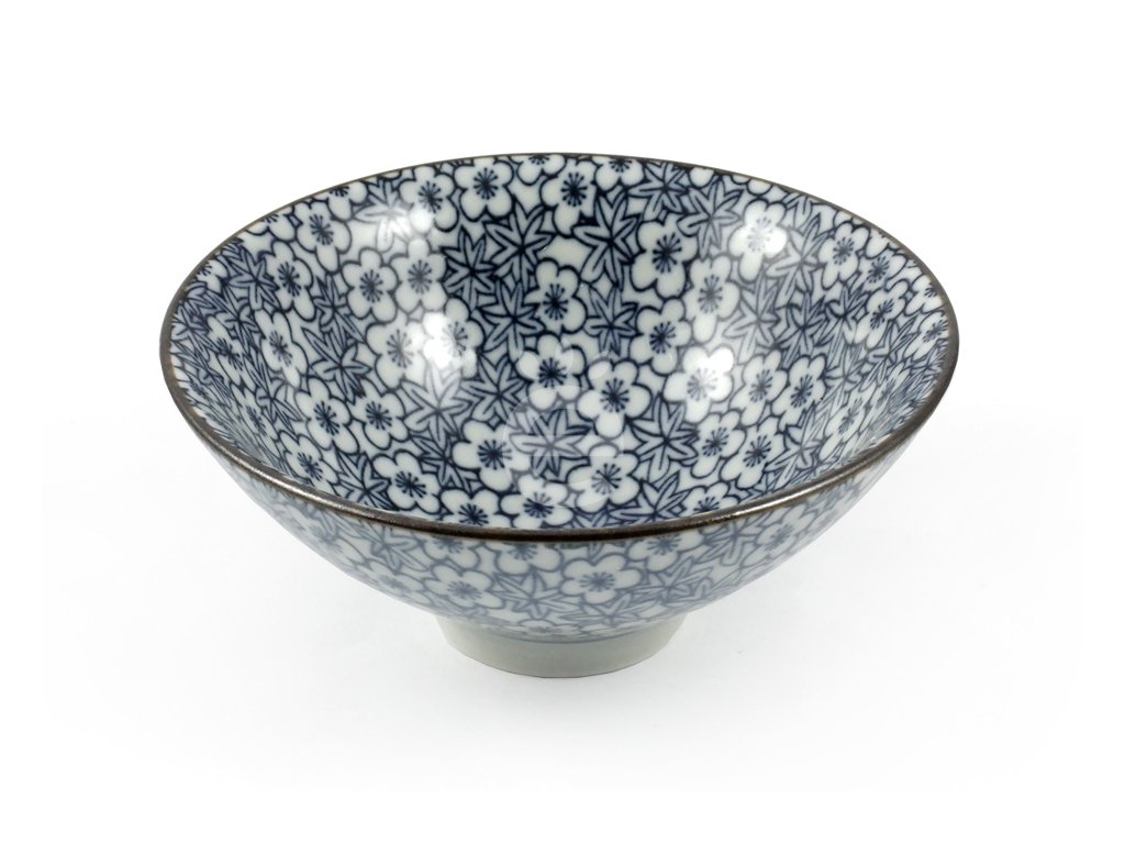 Čajová miska zdobená modrými květy a listy.