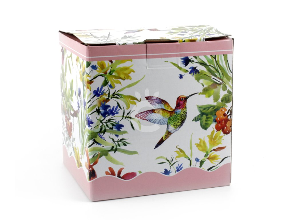 Čajová souprava pro jednoho, tzv. Tea for One, s motivem kolibříka. Obsahuje skleněnou konvičku, porcelánový šálek, sítko a podšálek.