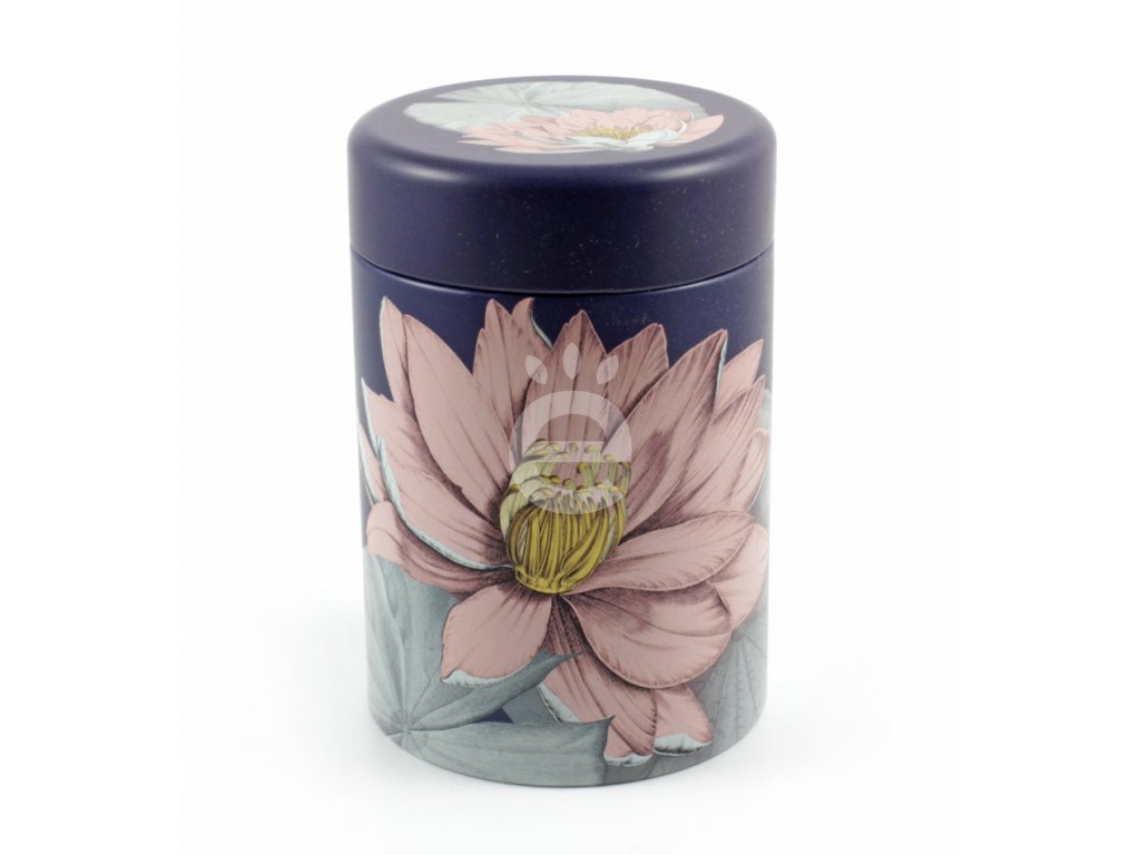 Plechová dóza na čaj v japonském stylu s motivem lotosového květu. Do dózy se vejde přibližně 125 g čaje, v závislosti na zpracování listu.