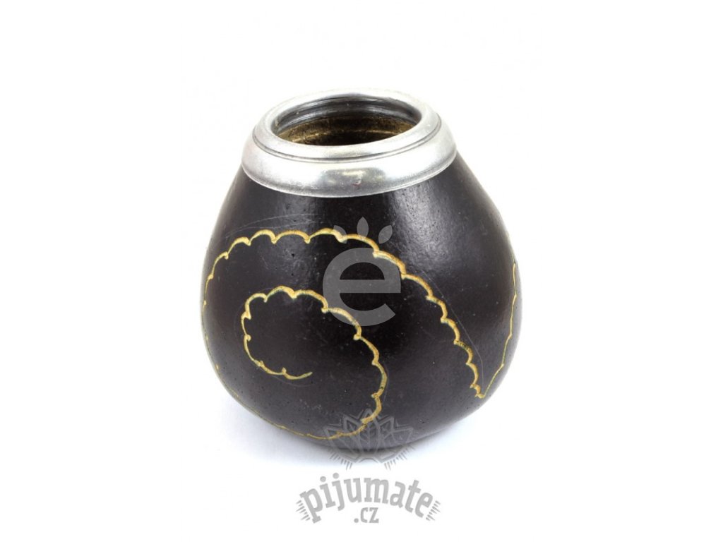 Černá kalabasa vydlabaná z pravé tykve a zdobená spirálovým dekorem. Nádoba o objemu cca 150 - 200 ml.