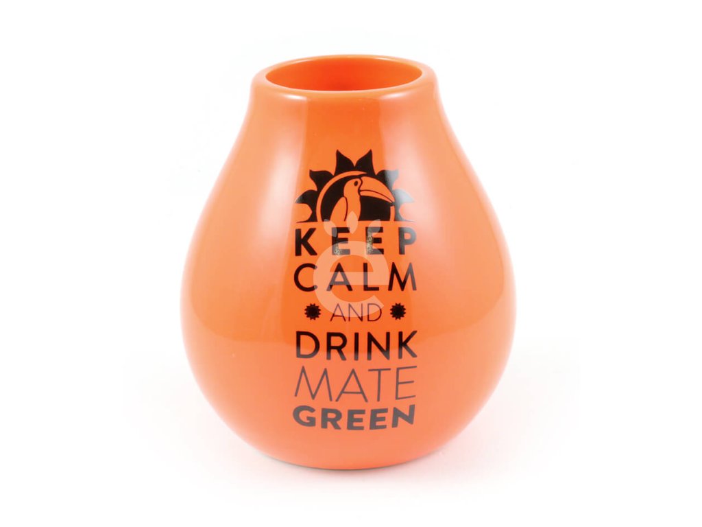 Keramická kalabasa oranžové barvy s nápisem Keep calm and drink mate green.
