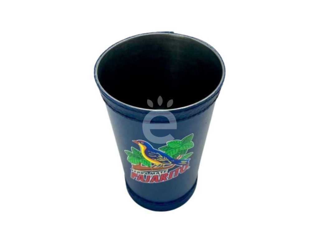 Kovový nerezový pohárek potažený umělou kůží s grafikou a logem značky Pajarito.