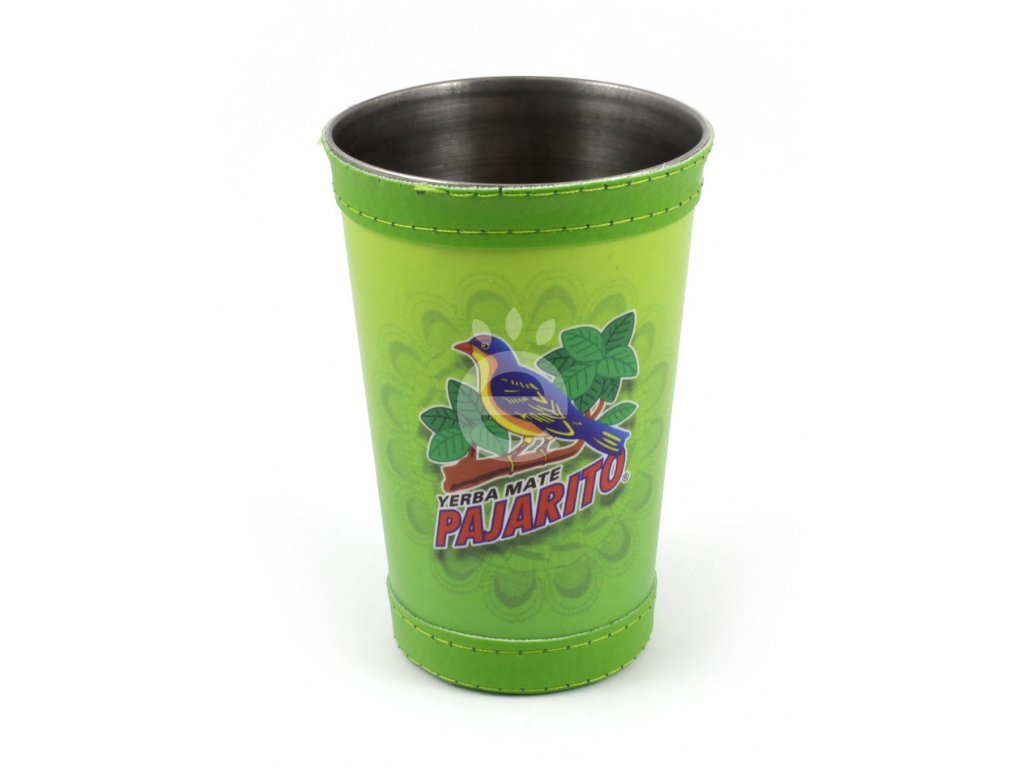 Kovový nerezový pohárek potažený umělou kůží s grafikou a logem značky Pajarito.