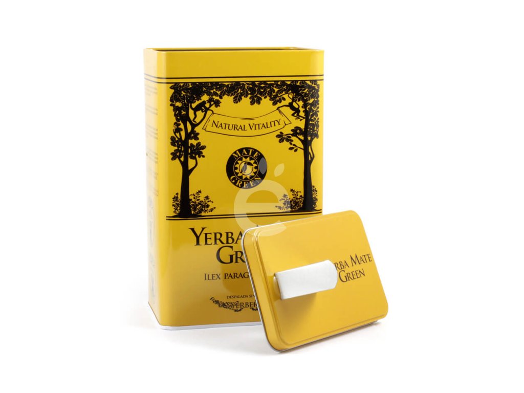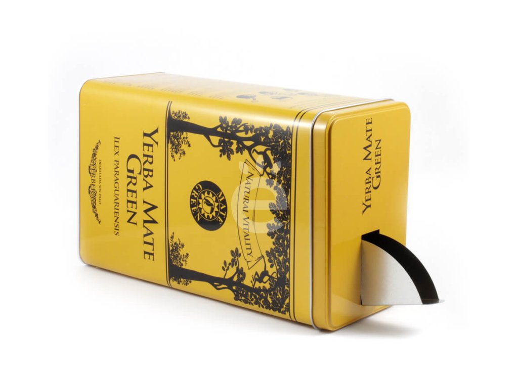 Plechová dóza na maté značky Mate Green s 400g balením Mate Green mas energia guarana. Víko nádoby má násypku. Díky tomu se maté lépe dávkuje a míň se rozsype okolo :-))
