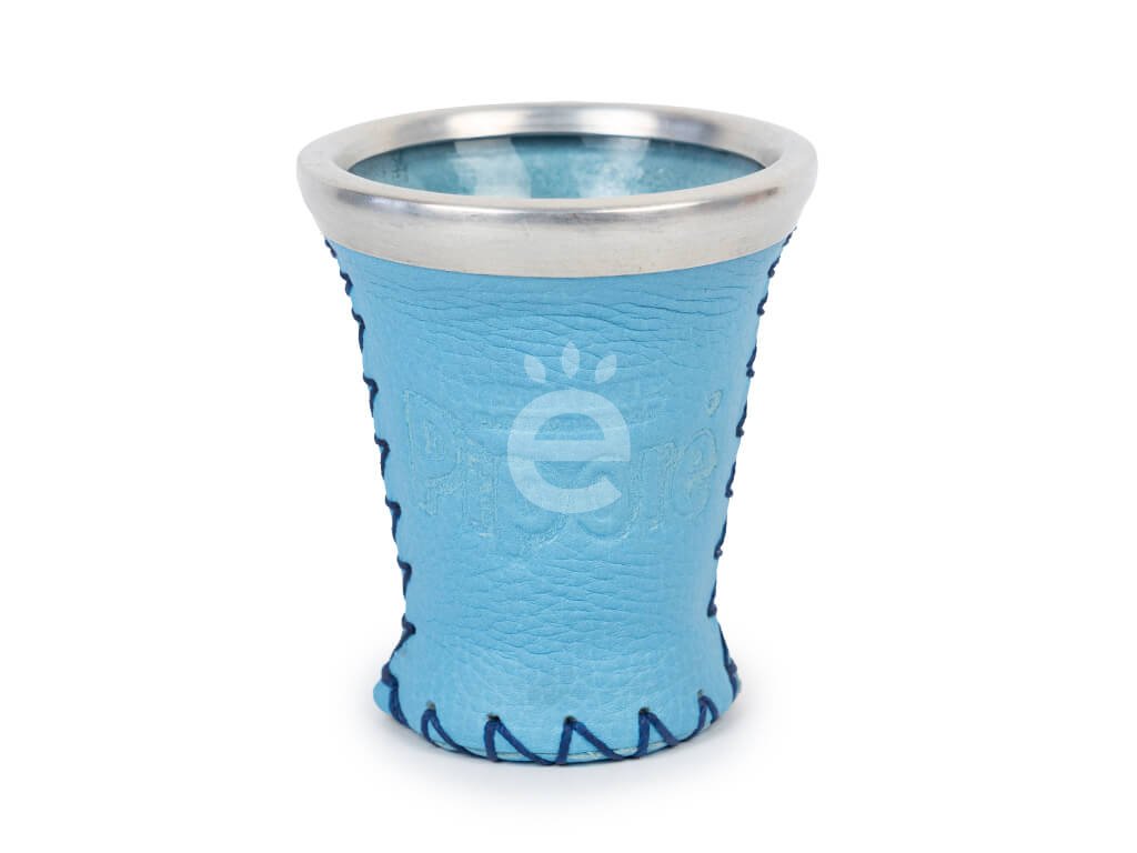 Skleněná nádoba k pití yerba maté potažená kůží s vyraženým logem Piporé a hliníkovým okrajem.