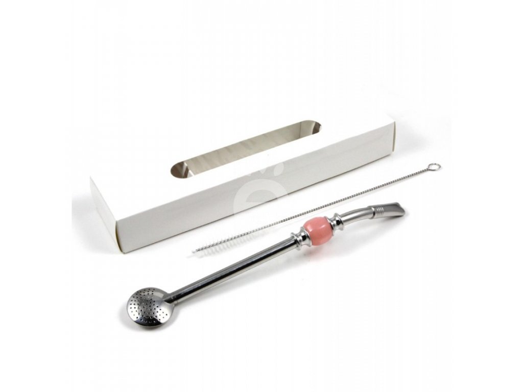Bombilla s růžovým kamenem o délce 21 cm z nerezové oceli + štěteček na čištění v krabičce.