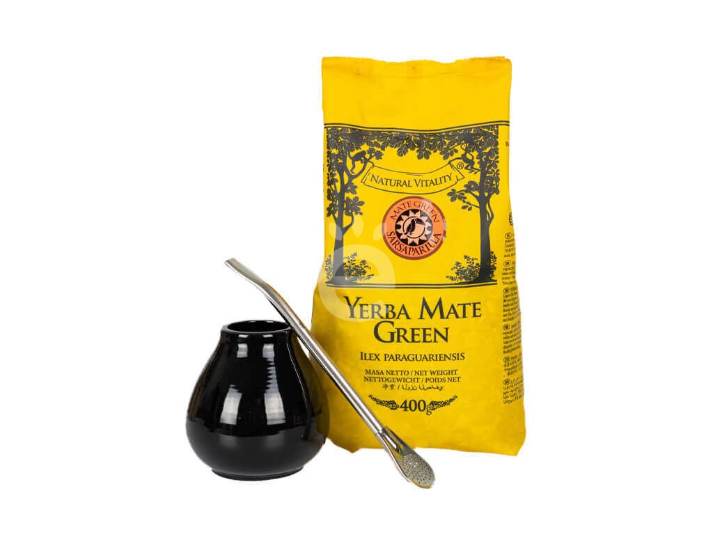 Set obsahuje Mate Green Sarsaparilla 400 g, černou keramickou kalabasu a jednoduchou nerozebíratelnou bombillu.