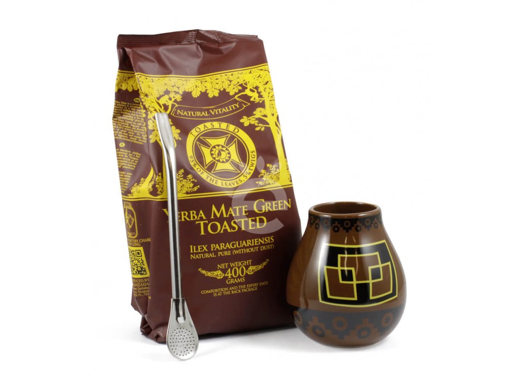 Set obsahuje Mate green Toasted 400 g, keramickou kalabasu a jednoduchou nerozebiratelnou bombillu.