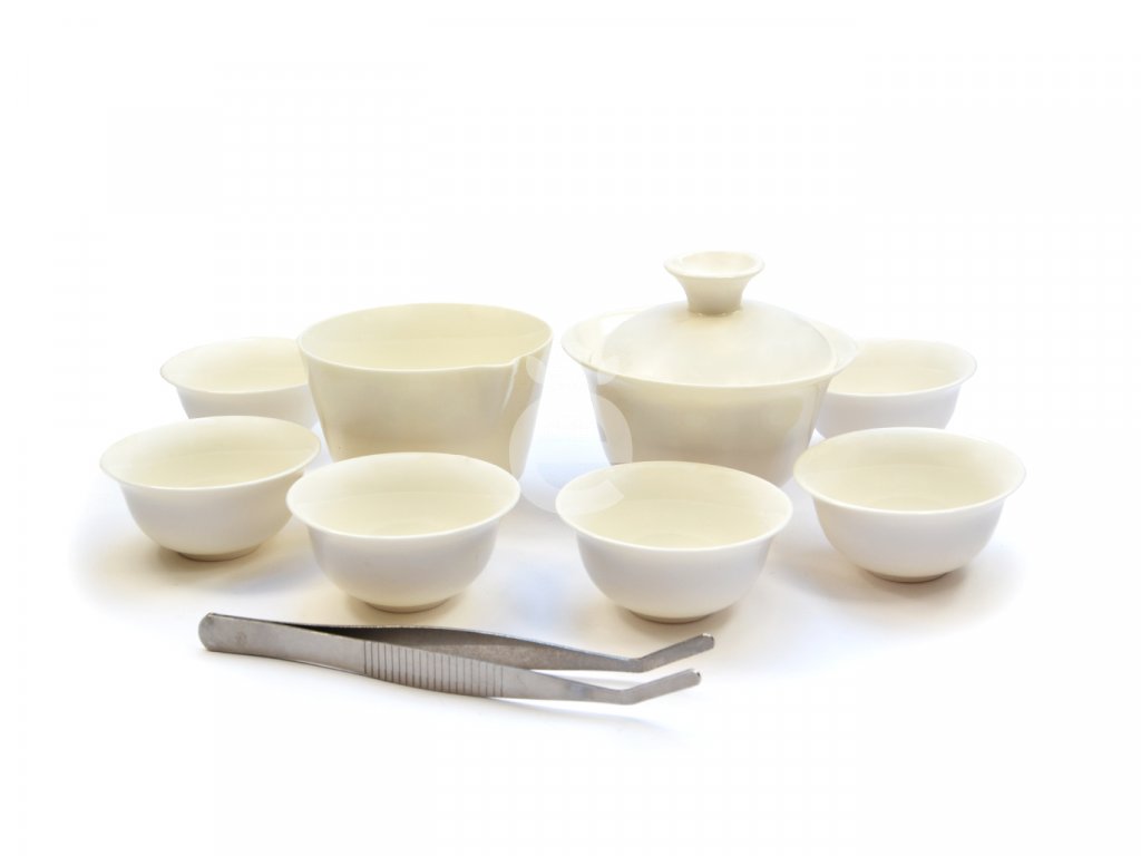 Praktická cestovní souprava. Malý gaiwan (zhong) a džbánek, šest šálků a kovová pinzeta.