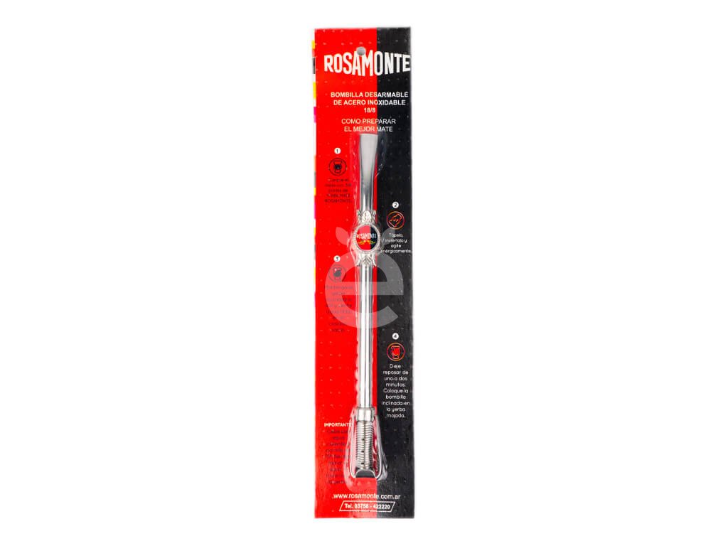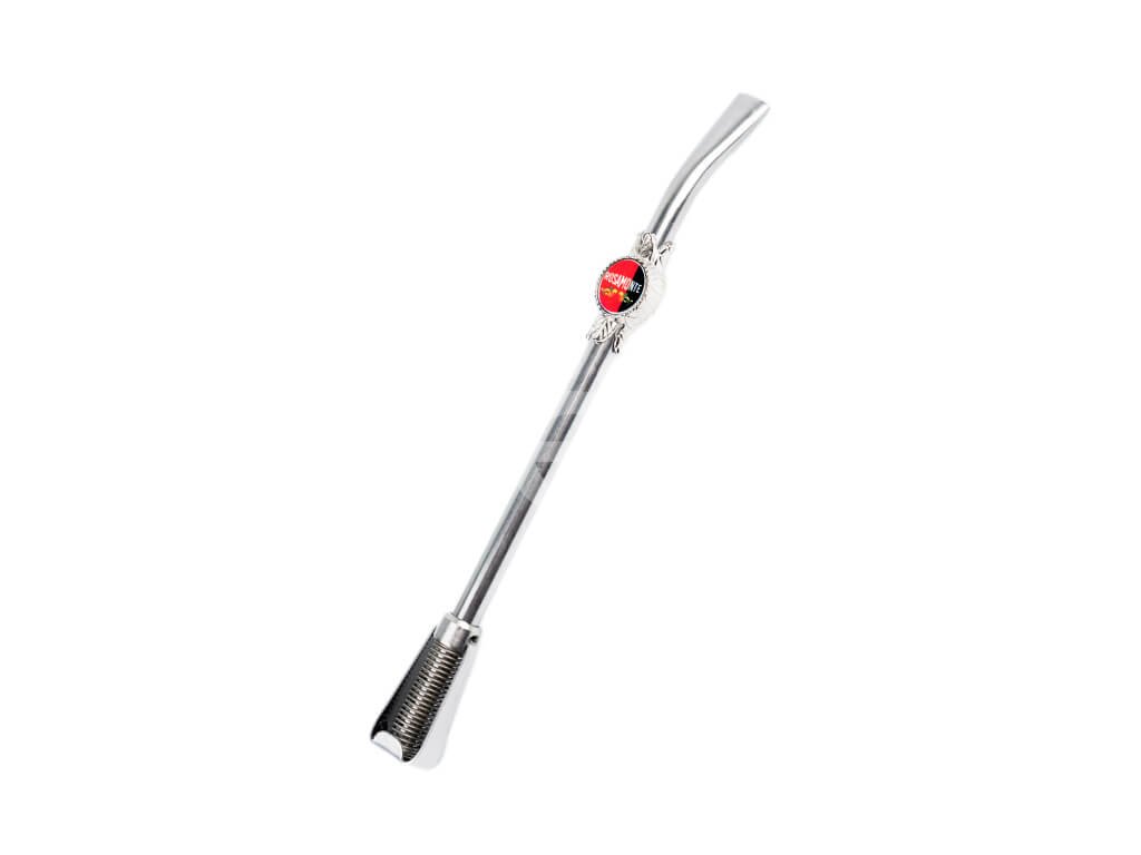 Luxusní nerezová bombilla o délce 19 cm s dvojitou filtrací, složenou z předvrtaných malých otvorů a pružiny.