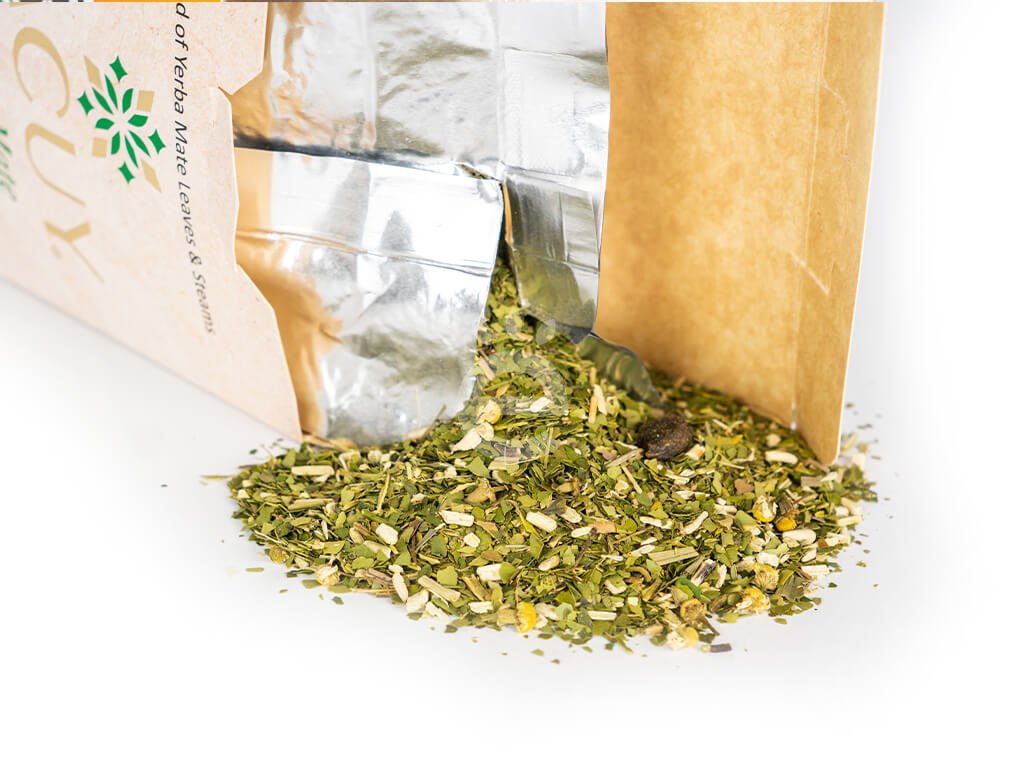 Složení: yerba maté (Ilex Paraguariensis) 93 %, heřmánek 2%, citronová tráva, květ anýzu, badyán, stévie, jalovec