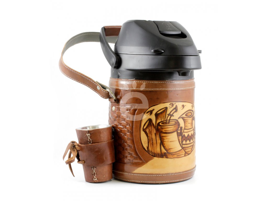 Termoska je obalená ozdobenou přírodní kůží s vyrytými a vypálenými motivy. Součástí setu je také plechový pohárek, taktéž obalený v kůži. Vše je ruční práce paraguayjských indiánů, každá termoska je originál.